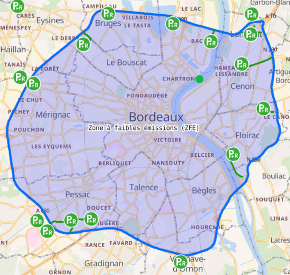 La carte ci-dessous illustre les zones concernées par la ZFE à Bordeaux Métropole.